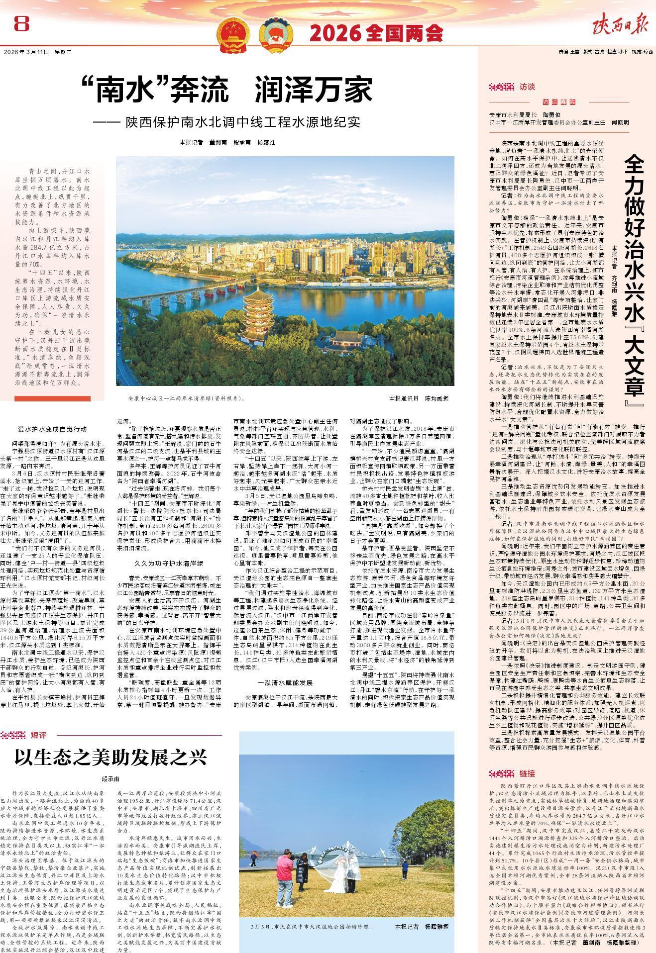 陕西是南水北调中线工程的重要水源涵养地,肩负着“一泓清水永续北上”的光荣使命。如何在高水平保护中,让这泓清水不仅北上润泽四方,还成为当地发展的源头活水、惠及群众的绿色福祉?近日,记者专访了安康市水利局局长陶勇俊、汉中市一江两岸开发管理委员会办公室副主任闫晓明。