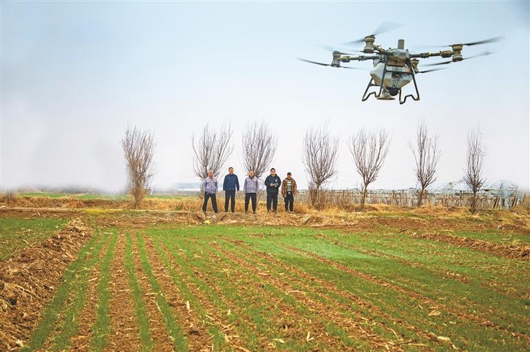 惊蛰至,春耕忙。3月5日,秦东大地春意浓,在渭南市临渭区官道镇小什村,绿油油的麦苗长势喜人。伴随着一阵轻微的嗡鸣声,一架植保无人机低空掠过,将化肥均匀洒向田间。