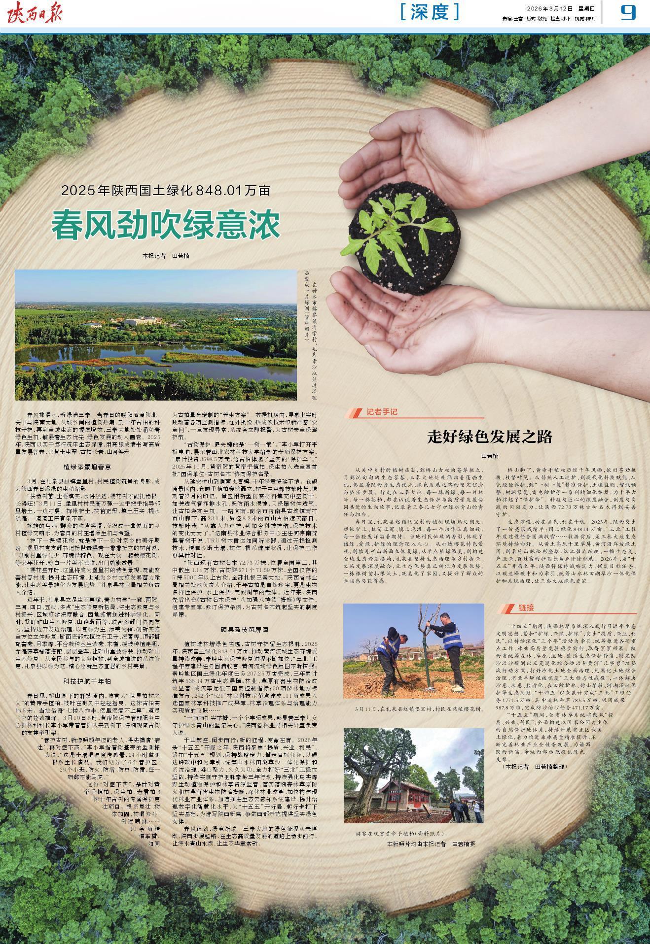 从关中乡村的植树热潮,到桥山古柏的苍翠挺立,再到沉甸甸的生态答卷,三秦大地处处涌动着蓬勃生机,彰显着陕西走生态优先、绿色发展之路的坚定信念与坚实步履。行走在三秦大地,每一抹新绿、每一片林海、每一株苍柏,都在诉说着生态保护与高质量发展协同共进的生动故事,记录着三秦儿女守护绿水青山的责任与担当。
