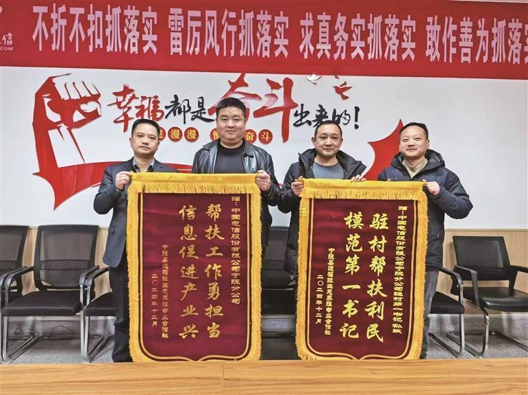 “这面锦旗代表全村人的心意,感谢电信公司九年如一日的真心帮扶!”2025年9月,汉中市镇巴县构园村历任村党支部书记3人将一面绣着“电信九载驻构园 真帮实扶谱新篇”的鲜红锦旗,交到中国电信镇巴分公司负责人手中,对电信驻村帮扶工作给予最高赞誉。九年时间里,镇巴分公司先后投入百余万元,组织技术团队翻山越岭勘测点位,克服山区地质复杂、施工条件恶劣等困难,实现4G信号全村覆盖、5G信号重点区域通达。如今,村民们靠着手机就能了解市场信息、销售农产品,信号通了,产业也活了。驻村队带着村民种中药材、种黄桃、养肉牛,靠着产业扶持,不少家庭年增收万元以上。