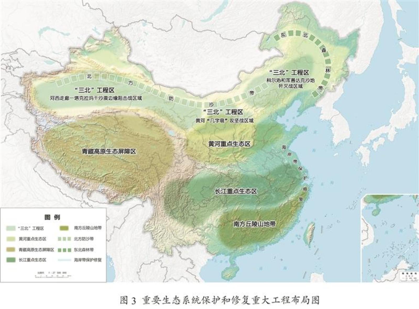 统筹推进重要生态系统保护和修复重大工程,持续巩固以“三区四带”为骨架的国家生态安全屏障体系。打好“三北”工程攻坚战,推动三大标志性战役取得决定性胜利。深入推进青藏高原生态保护,加强重点区域水土流失治理和石漠化治理。科学开展大规模国土绿化行动,推进森林质量精准提升和国家储备林建设,森林蓄积量达到224亿立方米,统筹草原生态修复与合理利用,加强湿地保护修复。推进超引地表水和超采地下水治理,开展历史遗留废弃矿山生态修复。