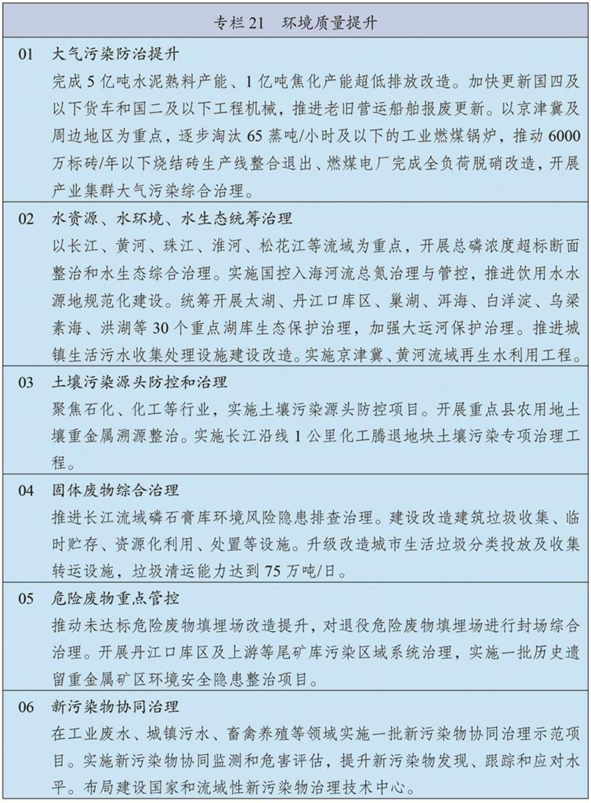 持续深入推进污染防治攻坚,以更高标准改善大气、水、土壤环境质量。以京津冀及周边、长三角、汾渭平原等重点区域为主战场,强化细颗粒物(PM2.5)控制,深入推进重点行业超低排放改造,推动挥发性有机物源头替代和全流程治理,制定下一阶段机动车排放和油品质量标准,深化大气环境绩效分级管理,氮氧化物、挥发性有机物排放量分别下降8%以上,进一步消除重污染天气。加强长江中游、成渝等区域大气污染防治。加强餐饮油烟、恶臭异味和环境噪声污染治理。统筹水资源、水环境、水生态治理,以解决全流域和跨省界突出问题为重点,加强重要江河湖库系统治理和生态保护,基本完成重点流域海域入河入海排污口排查整治,化学需氧量、总磷排放量分别下降6%,巩固城市黑臭水体治理成效、基本消除县乡黑臭水体。加强土壤污染源头防控,推进受污染耕地、建设用地安全利用。