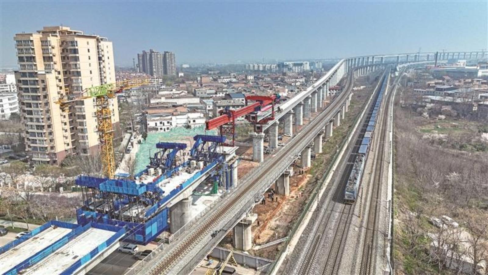 图为最后一孔32米单线箱梁在西安东站西南联络线下行线特大桥上精准落位(3月10日摄)。