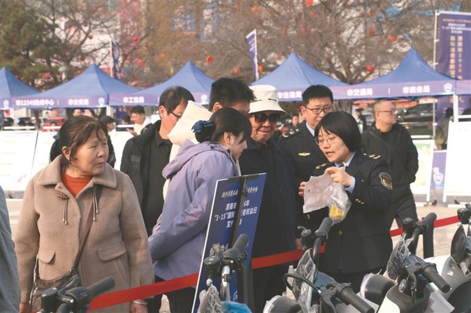 3月11日,渭南市开展“提升消费品质 守‘渭’消费市场”主题宣传活动。图为工作人员向群众普及假冒伪劣电动自行车识别方法。