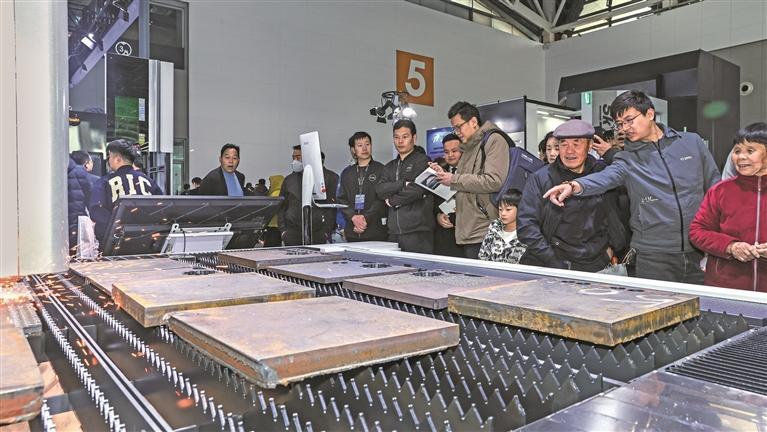 本届展会以“中国机床高端装备主场”为主题,吸引了700余个国内外领先机床品牌,集中展出金属切削机床、钣金及冲压设备、激光加工设备等热门产品及解决方案,全方位展示机床上下游产业链的创新成果。图为观众在观看激光切割机演示。