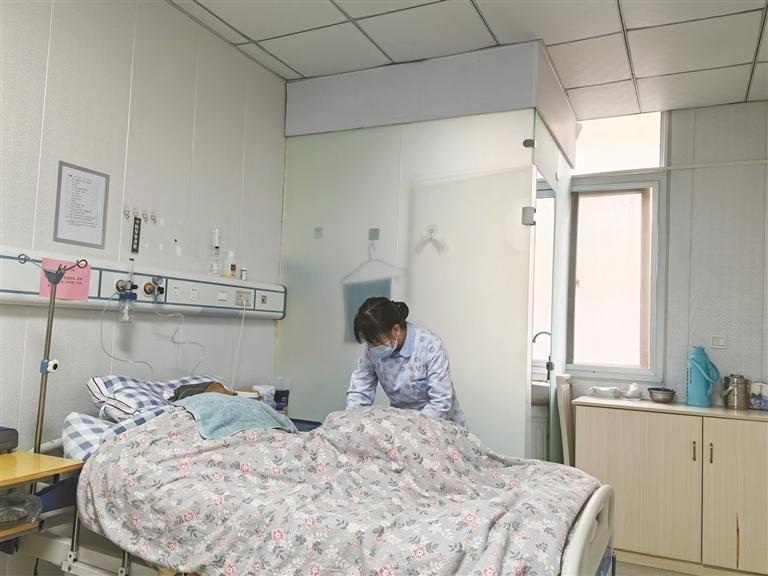 3月2日,在汉中职业技术学院附属医院医养中心(长护险照护中心)病房,护士为重度失能老人进行晨间护理。