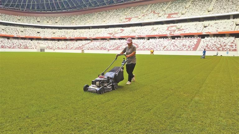 西安国际足球中心的草皮养护人员在进行场地维护(资料照片)。