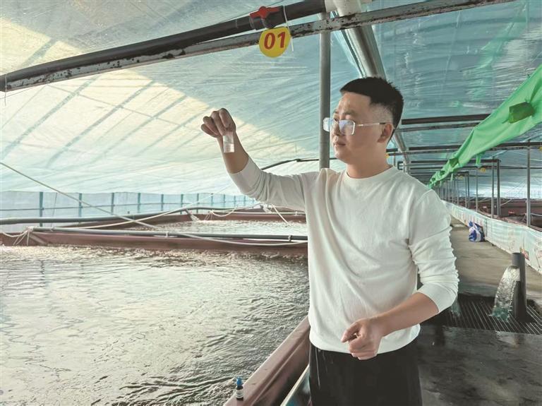 “南美白对虾对生长环境要求较高,我们通过科技手段把盐度、水温等精准控制在适宜范围,同时实现饵料精准投喂,既保证其生长速度,又提升成活率。”车间技术管理人员文杰说,这种工厂化水产养殖模式打破了传统水产养殖的季节限制,一年有3个养殖周期,水产品产量和品质均有极大提升。