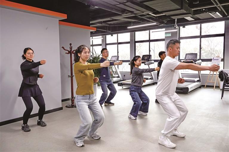 3月15日,陕西中医药大学附属医院健康管理(治未病)中心内,教练员带领学员运动。