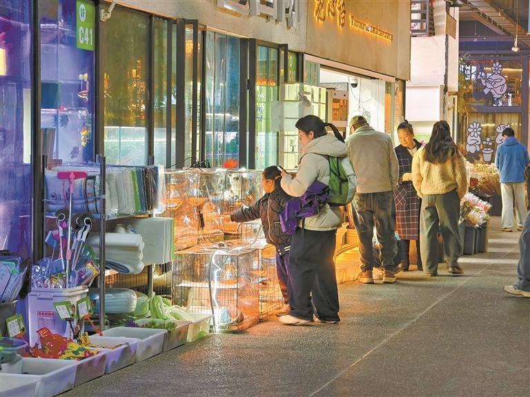 夜幕降临,城市的灯光次第亮起,点亮一处处商圈。脱口秀剧场里,演员的调侃引发笑声阵阵;“谷子”店里,年轻人三五成群、人头攒动;宠物互动区的玻璃窗前,带娃的家长轻声逗弄着慵懒的小猫;文创市集的摊位前,趣味相投的摊主与顾客互加微信;街区的小径上,老人漫步、情侣依偎……