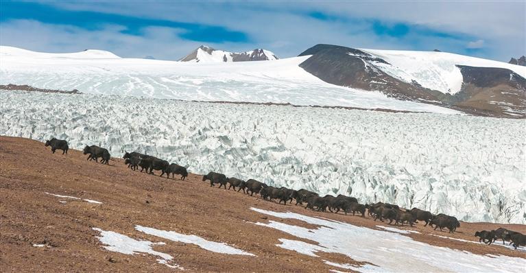 3月21日是世界冰川日。青藏高原是地球上中低纬度地区冰川分布最广泛的地区,众多形态各异的冰川构成了雪域高原独特的壮美画卷。藏色岗日冰川位于西藏自治区北部羌塘国家级自然保护区深处,远离人类活动区域。3月中旬,这里最低气温零下20多摄氏度,羌塘国家级自然保护区那曲地区管理局措罗木管理站的野生动物专业管护队员顶风冒雪前来巡护,与上百头野牦牛组成的种群不期而遇。 新华社发(四郎江村摄)