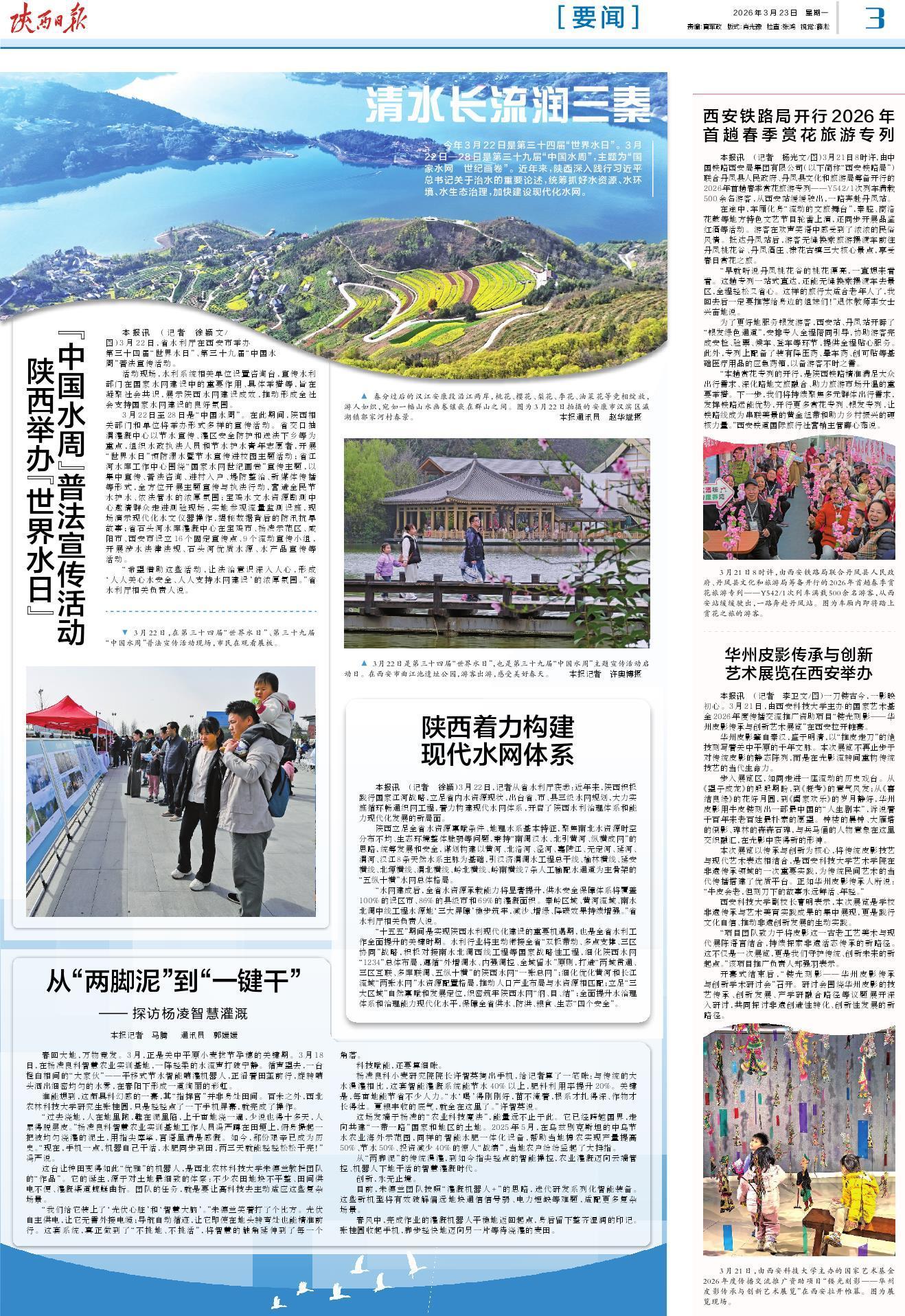 今年3月22日是第三十四届“世界水日”。3月22日—28日是第三十九届“中国水周”,主题为“国家水网 世纪画卷”。近年来,陕西深入践行习近平总书记关于治水的重要论述,统筹抓好水资源、水环境、水生态治理,加快建设现代化水网。