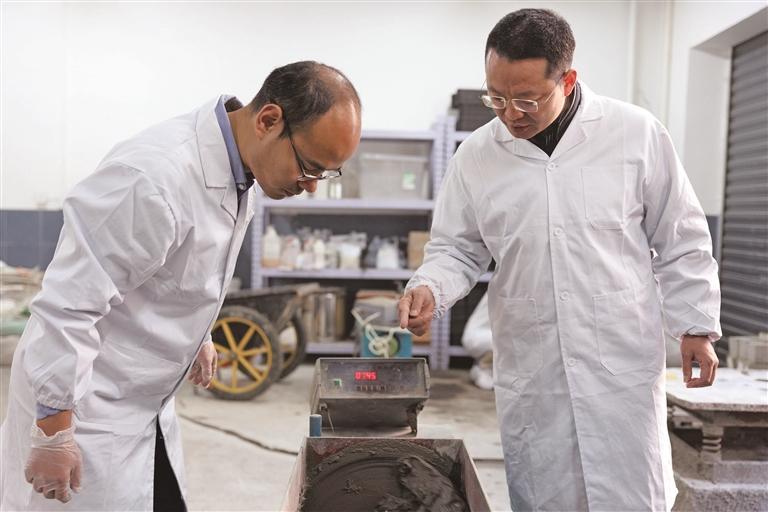 邓明科(右)在实验室进行“高延性混凝土条带加固技术”实验(资料照片)。