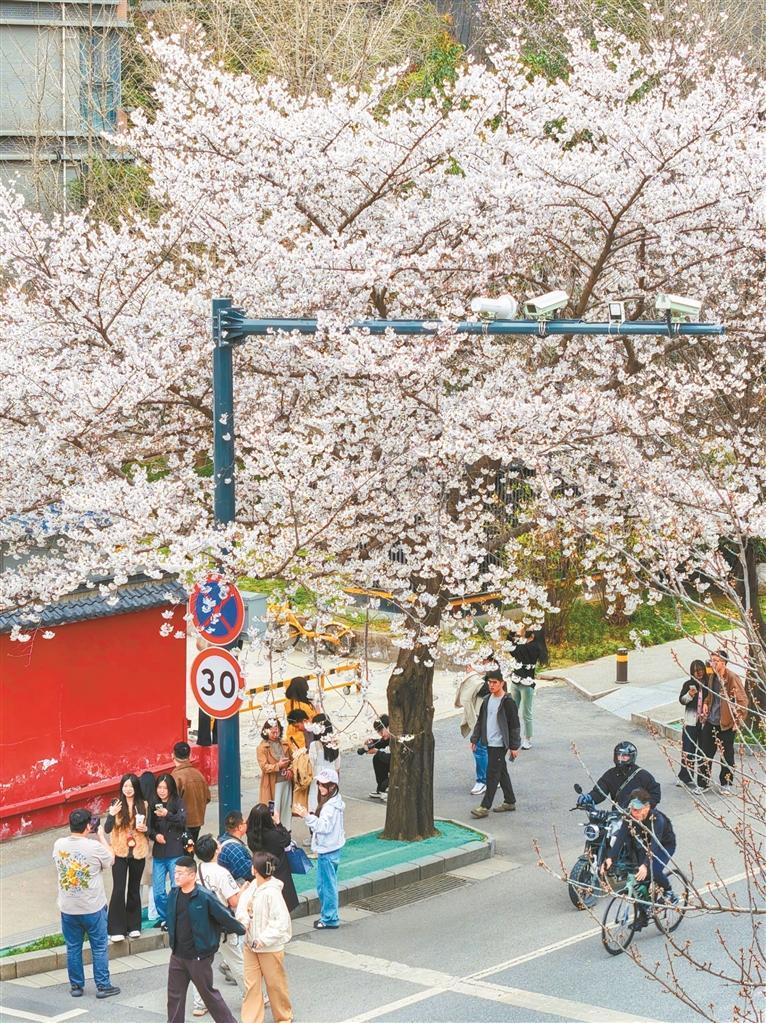 西安曲江池西路的樱花盛开,吸引不少行人驻足拍照(3月22日摄)。