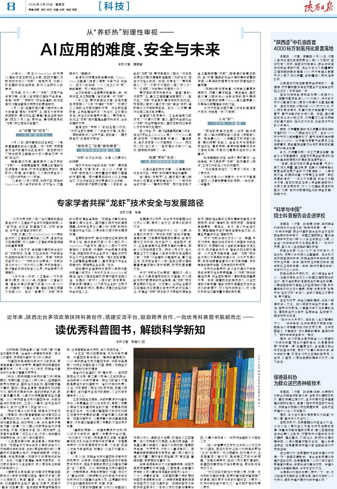 “《关于深入实施“人工智能+”行动的意见》要求,到2027年,我国新一代智能终端、智能体等应用普及率超70%;到2030年,我国新一代智能终端、智能体等应用普及率超90%。在这一背景下,‘龙虾’技术的出现可谓生逢其时。”陕西省计算机学会理事长周兴社说。面对国务院发布的慎用提醒,他呼吁业界应认真分析“龙虾”的技术机理与安全风险,为更好地利用该技术提供支撑。