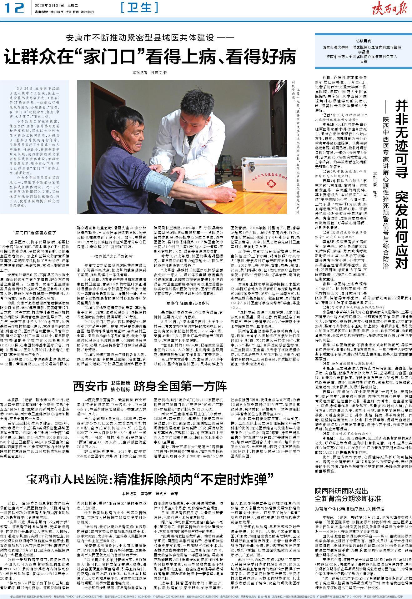 今年政府工作报告提出,健全医疗、医保、医药协同发展和治理机制,深化以公益性为导向的公立医院改革,加强县区、基层医疗机构运行保障。围绕基层医疗卫生改革中的人事编制、设施设备、薪酬分配等难点问题,陕西省持续深化紧密型县域医共体建设,推动优质资源共享、服务重心下移,努力让群众在“家门口”看得上病、看得好病。