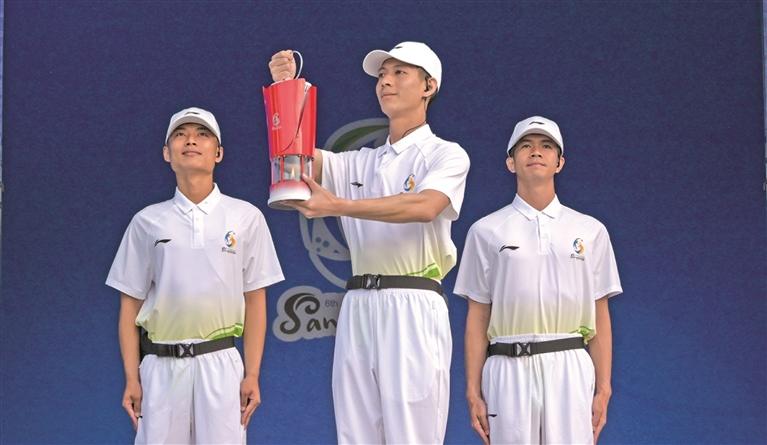 3月30日,火种采集仪式后,火种护卫队队员向现场观众展示火种。当日,第六届亚洲沙滩运动会火炬传递活动在海南三亚举行。 新华社记者 杨冠宇摄