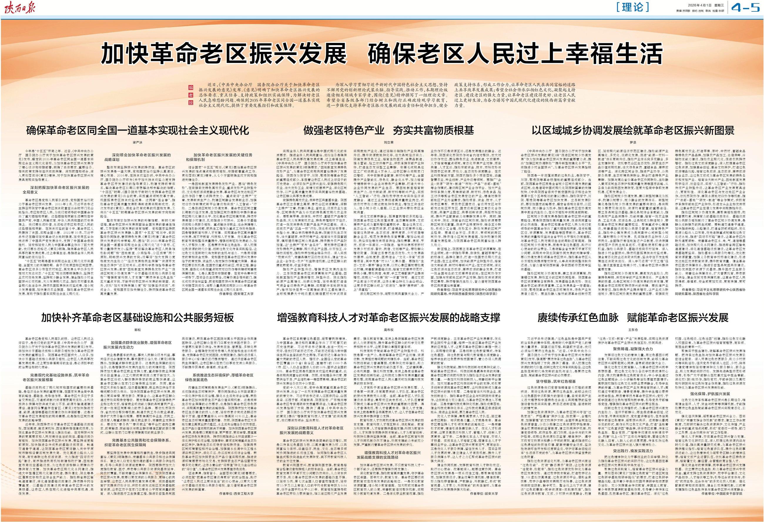 今年是“十五五”开局之年。近日,《中共中央办公厅 国务院办公厅关于加快革命老区振兴发展的意见》发布,锚定到2035年革命老区同全国一道基本实现社会主义现代化目标,为加快革命老区振兴发展作了精心设计和安排部署,明确了总体要求、重要任务、相关政策支持与组织实施保障。深刻把握和领会、深入贯彻落实好《意见》精神,对于加快革命老区振兴发展具有现实指导意义。