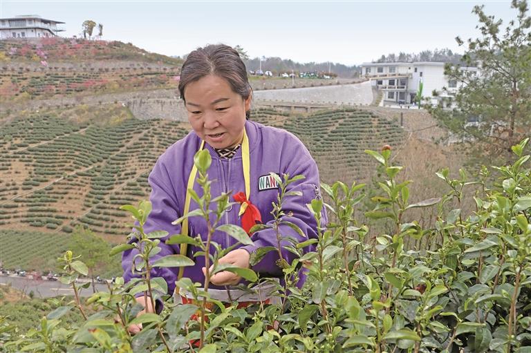 三月二十五日,商南县富水镇茶海公园里,工人在采茶。 本报通讯员 李潇摄