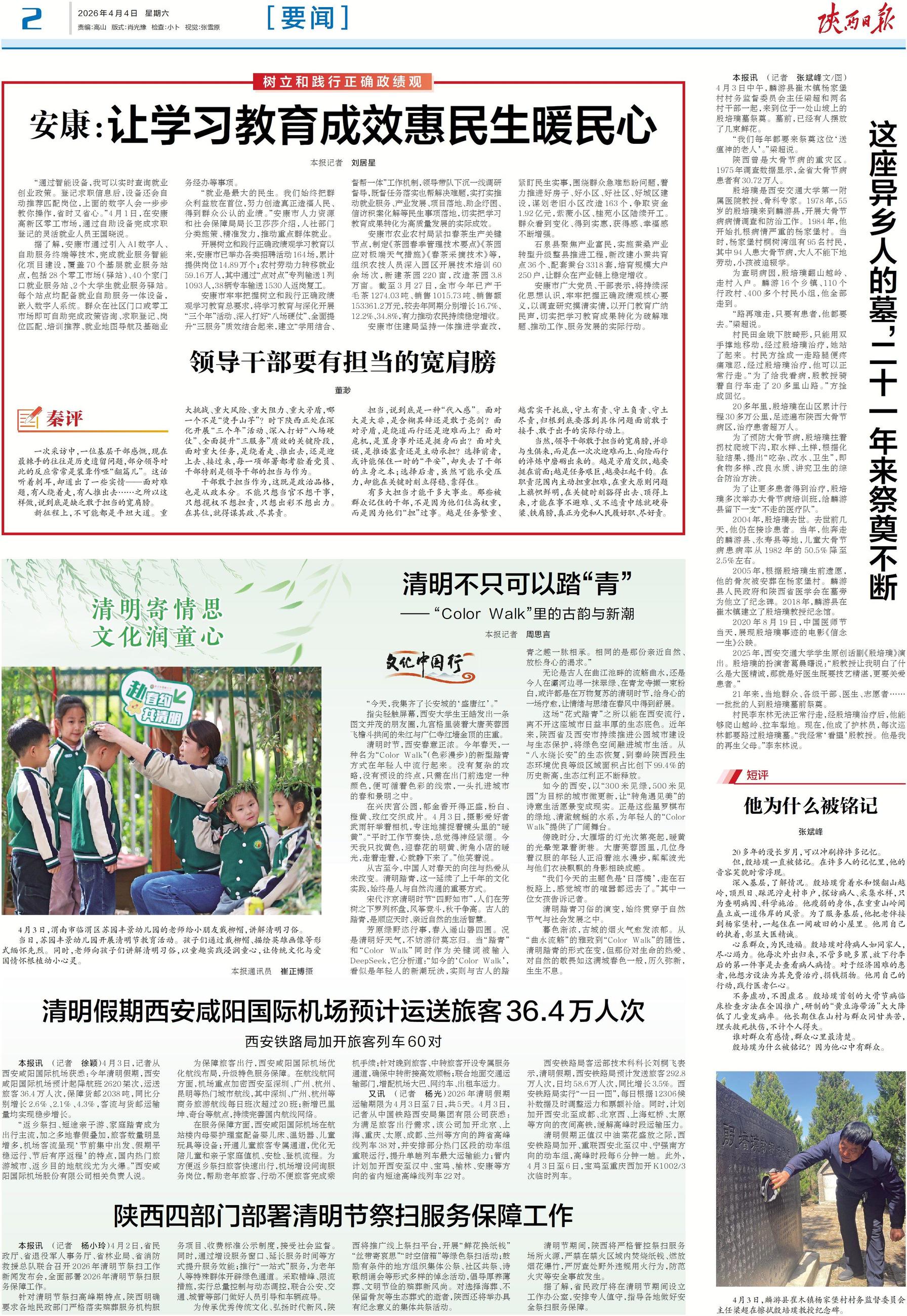 4月3日,麟游县崔木镇杨家堡村村务监督委员会主任梁超在擦拭殷培璞教授纪念碑。