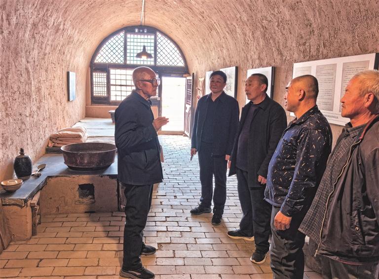 4月2日,在绥德县枣林坪镇沟口村中国工农红军东征指挥所旧址,李玉林(左一)给游客讲述红色故事。 本报通讯员 张丹摄