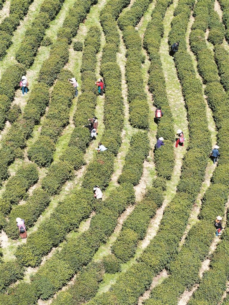 4月2日,在西乡县“江塝茗园”茶园里,茶农指尖轻捻采摘新茶。