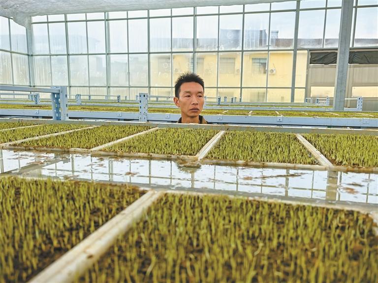 “我们有智能温室,温度、湿度都能精准调控,秧苗长得又齐又壮。”该合作社技术总监来明波一边检查秧苗覆水情况,一边笑着说。