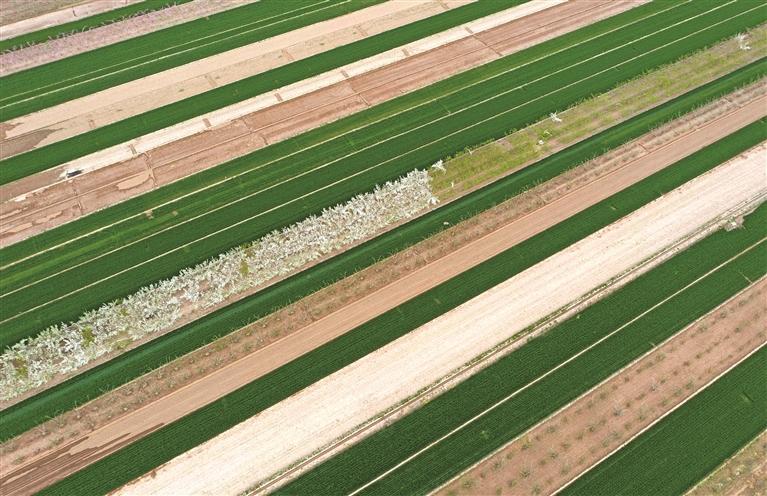 图为4月5日拍摄的合阳县黑池镇北庄村的农田。近期,当地农民抢抓农时开展春灌、春耕。黄河水通过东雷抽黄工程润泽万亩良田。 本报通讯员 崔正博摄