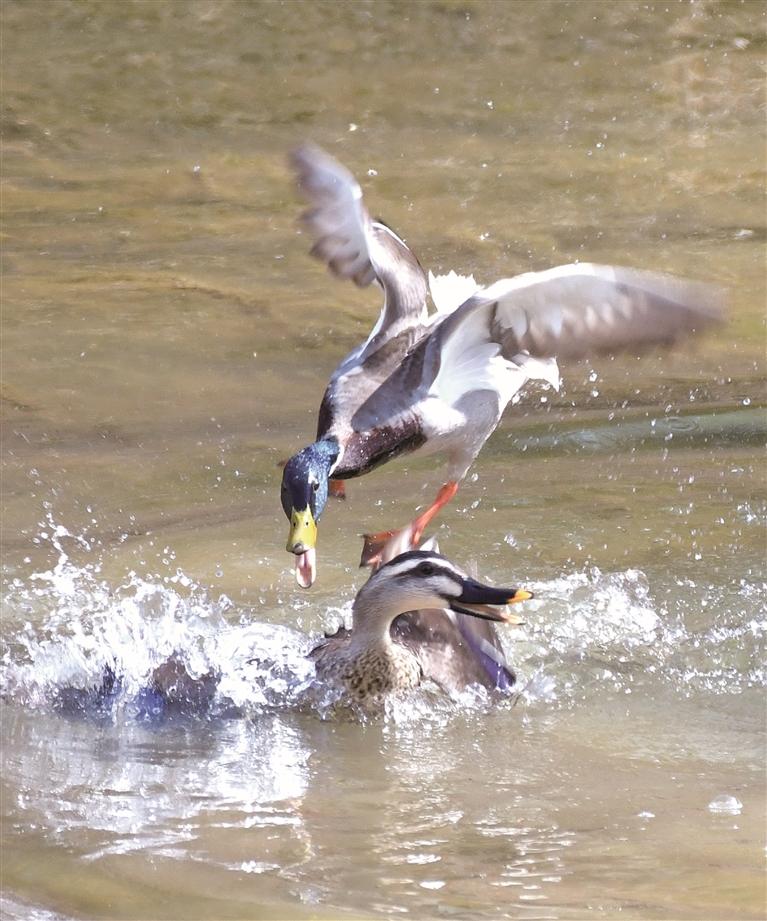 眼下正是候鸟迁徙的高峰期,延安陆续迎来众多夏候鸟及旅鸟。图为4月7日在延安市宝塔区枣园街道邓家沟村附近的西川河边拍摄的戏水中的绿头鸭与斑嘴鸭。 本报通讯员 王德荣摄