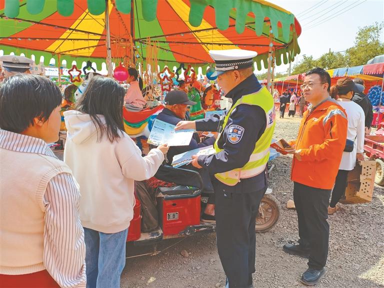 4月6日,澄城县公安局交管大队联合澄城县某保险公司组成宣传队,以韦庄镇民俗活动为契机,在现场开展以“倡导文明出行·共筑平安家园”为主题的农村道路交通安全宣传活动,让平安出行的理念深入人心。图为民警联合保险公司志愿者给群众普及道路交通安全知识。 本报通讯员 姬磊磊摄