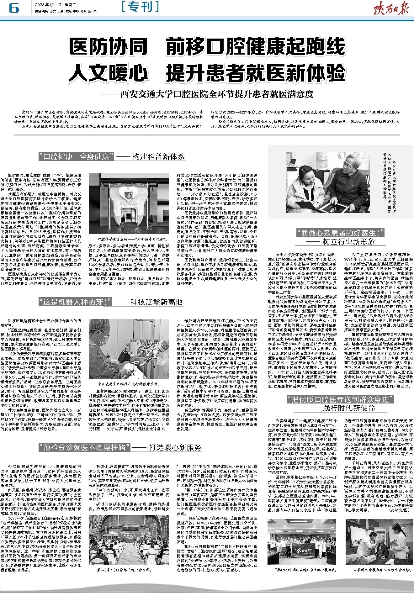 西安交通大学口腔医院精准发力,协同共进,在高质量发展的征程上,聚焦健康中国战略,实施医防协同建设、大力开展医学人文关怀,以实际行动践行为人民服务的初心。