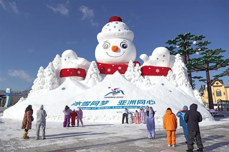 时隔近30年,哈尔滨再度与亚冬会结缘。松花江北岸的冰雪大世界里,中国天坛祈年殿遥对新加坡鱼尾狮,印度泰姬陵“遇见”卡塔尔卢塞尔体育场……亚奥理事会成员国家和地区的地标景观,以冰雪之姿与游客见面,一幅冰雪盛会的美丽图卷徐徐展开。