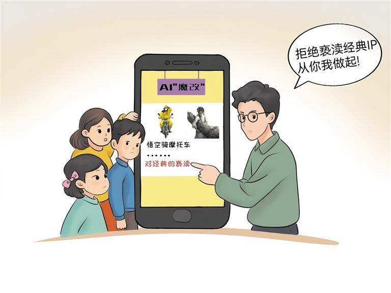 孙悟空骑摩托车、林黛玉倒拔杨柳……一系列被AI魔改的经典影视剧在网络上迅速走红。近日,国家广播电视总局网络视听节目管理司发布的《管理提示(AI魔改)》指出,一些视频为博流量,毫无边界地亵渎经典IP,冲击传统文化认知,与原著精神内核相悖,必须制止。 张琪悦作