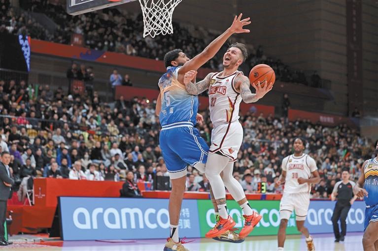 2月9日,新疆伊力特男篮和浙江稠州金租男篮(白色球衣)在比赛中。本报记者 肖阳熠摄