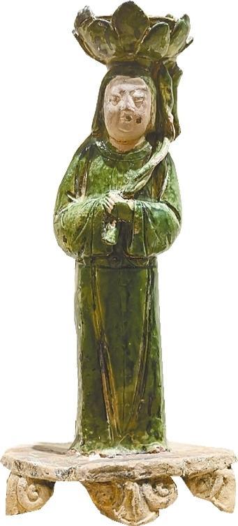 三彩莲灯侍女俑高29.5厘米、宽6厘米。侍女身穿绿色圆领长袍,头顶莲花形状的灯盏,足踩六角形云台,云台下有祥云状支脚。