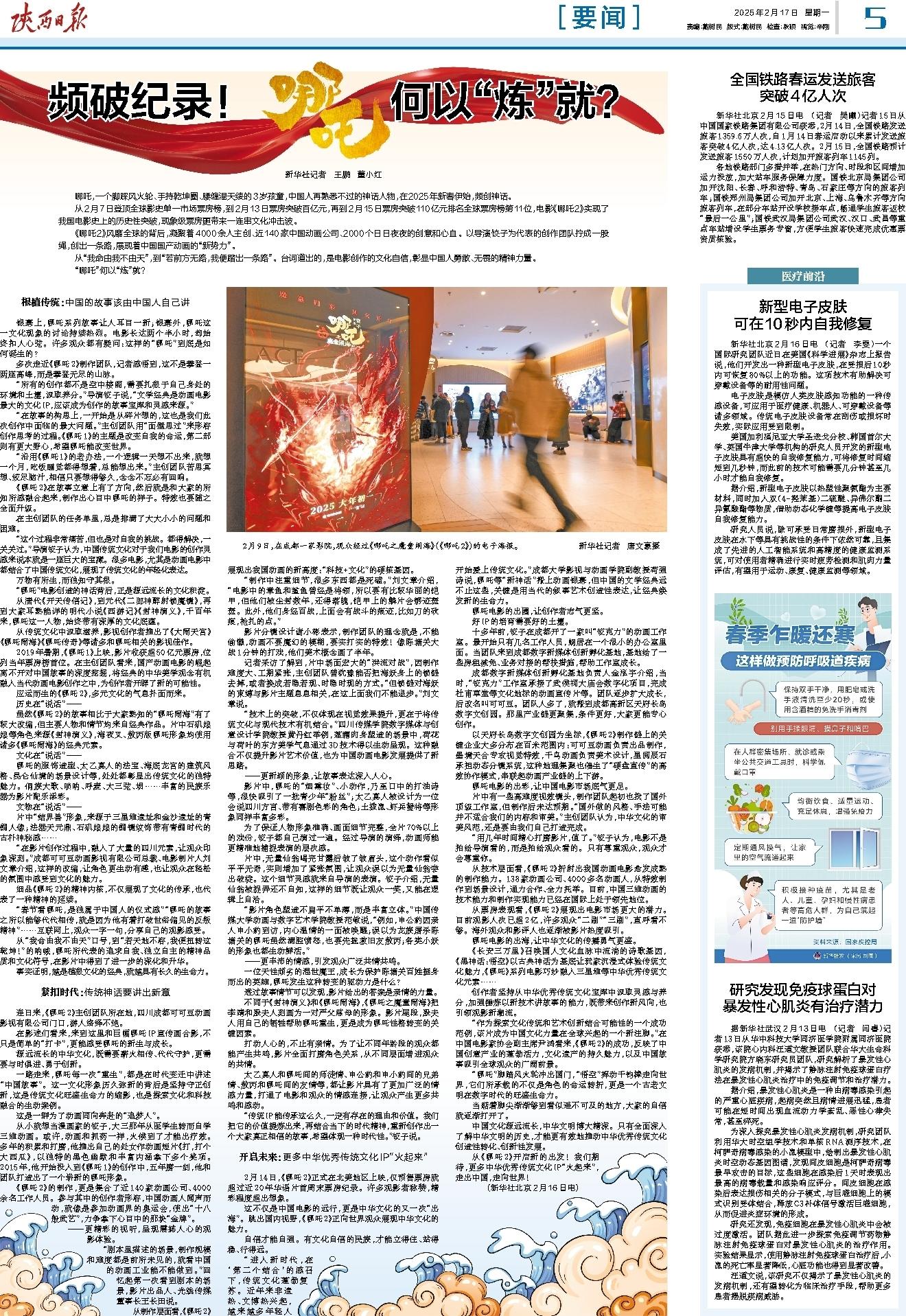 从2月7日登顶全球影史单一市场票房榜,到2月13日票房突破百亿元,再到2月15日票房突破110亿元排名全球票房榜第11位,电影《哪吒2》实现了我国电影史上的历史性突破,现象级票房更带来一连串文化冲击波。
