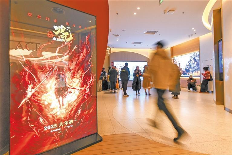 2月9日,在成都一家影院,观众经过《哪吒之魔童闹海》(《哪吒2》)的电子海报。 新华社记者 唐文豪摄
