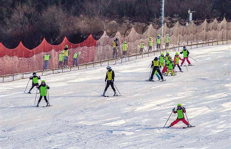 2月3日,在铜川照金国际滑雪场,冰雪研学团队的学员在教练的指导下,从初级雪道依次滑下。 本报记者 杨光摄