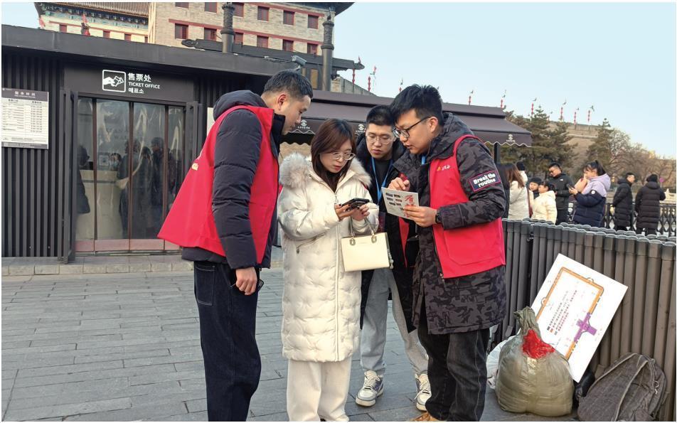 2月11日,西安城墙景区,文旅志愿者向游客介绍西安城墙智能客服使用方法。