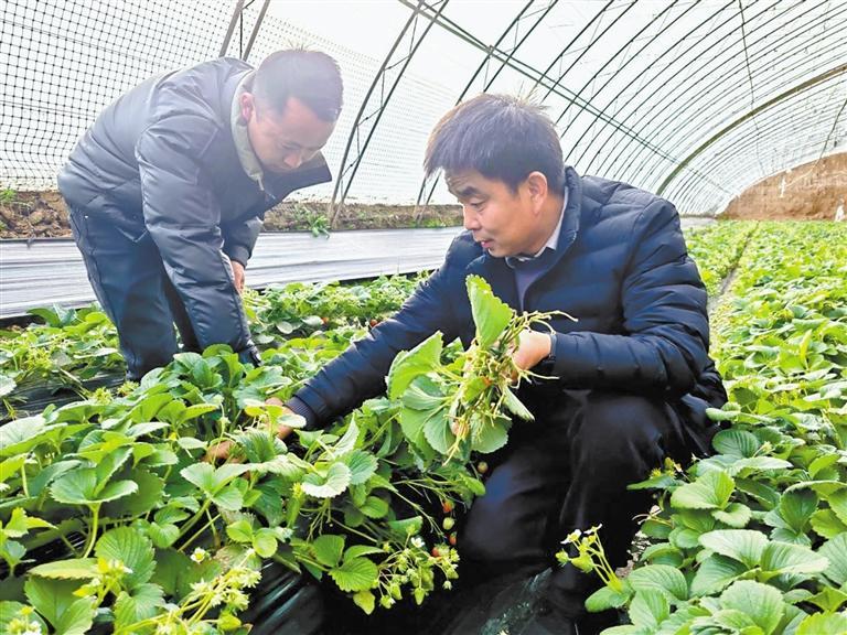 “胡老师,您看看草莓长势咋样?肥水合理不?第二茬要怎么管?”2月17日,在杨凌千馨农业专业合作社的草莓大棚里,负责人刘永锋向胡荣国咨询草莓种植管理问题。