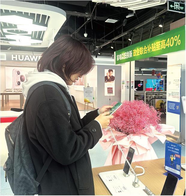 2月18日,在陕西苏宁易购销售有限公司西安太白南路店,顾客在体验新品手机功能。 本报记者 肖倩摄