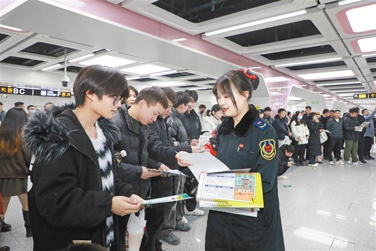 2月21日,西安市轨道交通集团有限公司运营分公司联合西安市消防救援支队,在西安地铁电视塔站开展电动车消防安全科普宣传系列活动。图为西安地铁工作人员向乘客发放电动车消防安全宣传单。