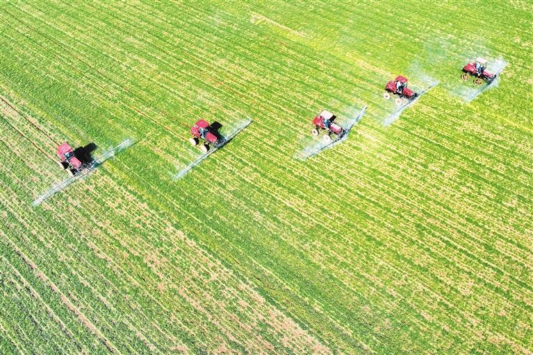 2月25日,在西安市长安区引镇街道赵家坡常村,5台自走式高杆喷雾机对1800亩麦田进行化学除草作业。 本报记者 许奥博摄
