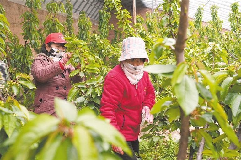 2月19日,工人在铜川金樱之星农业科技有限公司的大棚里清理樱桃树坐果后残留的花蕊。 本报记者 王志辉摄