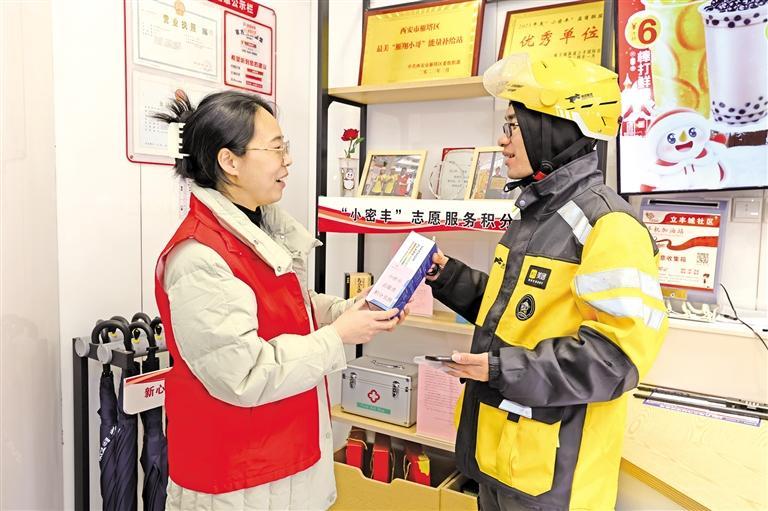 二月二十日,在雁塔区电子城街道立丰城社区的“雁翔小哥”能量补给站,外卖小哥使用“小密丰”志愿服务积分兑换礼品。本报记者 母家亮摄