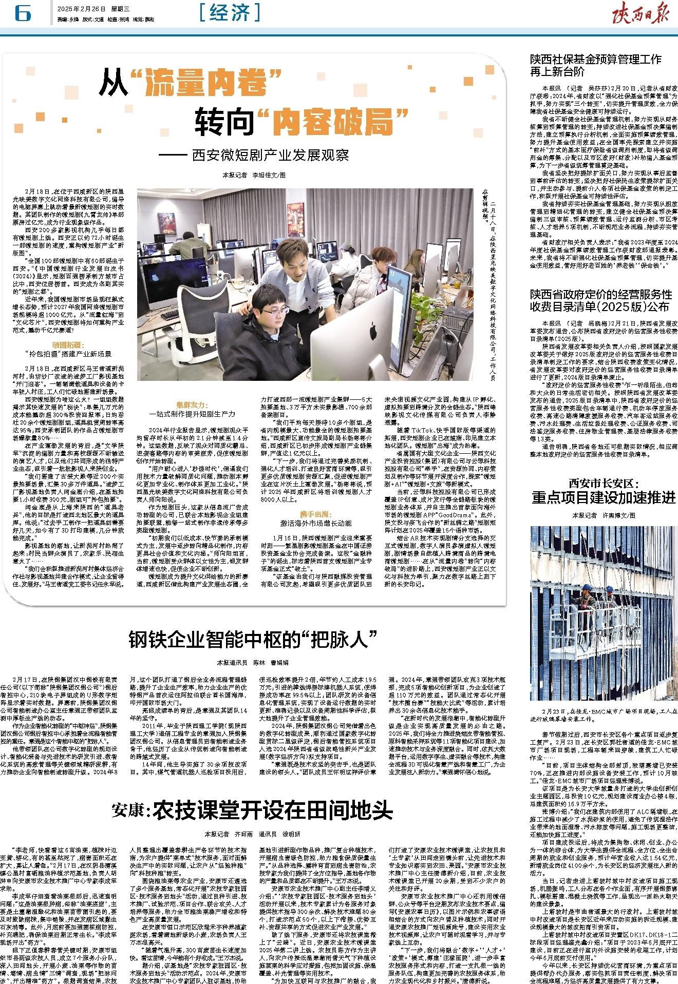 2月18日,在位于西咸新区的陕西星光映美数字文化网络科技有限公司,编导的电脑屏幕上跳动着最新微短剧的实时数据。其团队制作的微短剧《九霄龙帅》单部票房过亿元,成为行业现象级作品。
