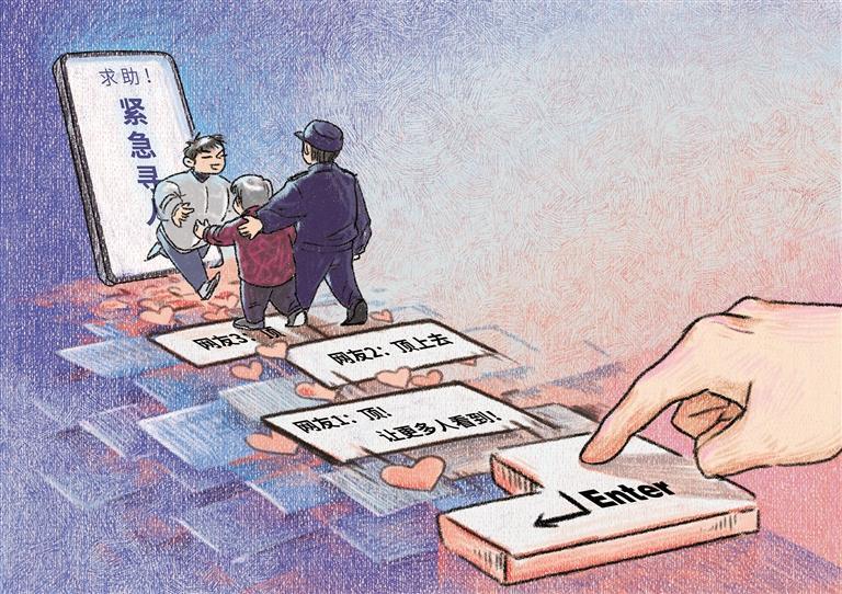网友一篇篇善意的跟帖,为老人铺就了一条温暖的回家路。简单的“顶”字背后,折射出网络空间的正面力量,也展现了人们通过社交媒体助人为乐的精神。让“按键”成为助人的力量,我们期待网络上有更多这样温暖的故事。