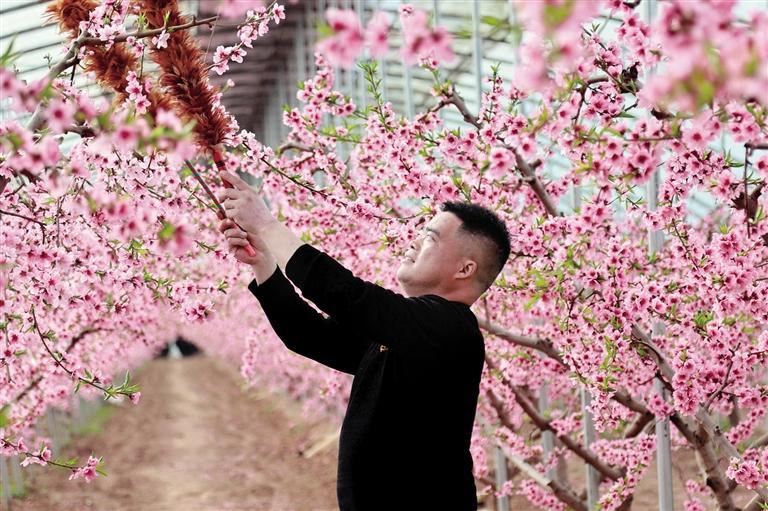 2月17日,大荔县范家镇南干村村民马红涛的4亩温室大棚里,桃花绚丽绽放,美不胜收。马红涛使用鸡毛掸子为油桃授粉。这种“土办法”既简便又实用,可提高坐果率。本报通讯员 李世居摄