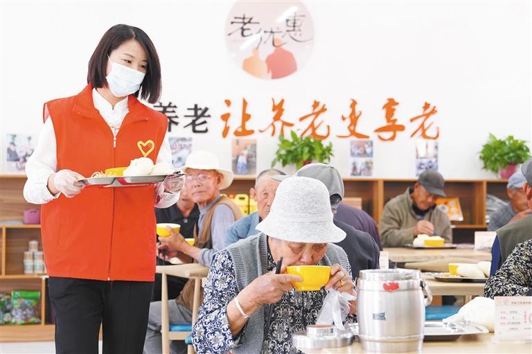 2024年5月10日,在山东省日照市岚山区安东卫街道凤凰山社区养老服务中心,志愿者在为老人端饭。日照市岚山区近年来积极探索新型养老模式,通过“区财政+村级集体+社会各界+老人子女”的共建机制,建设村(社区)级养老综合服务中心。 新华社记者 郭绪雷摄