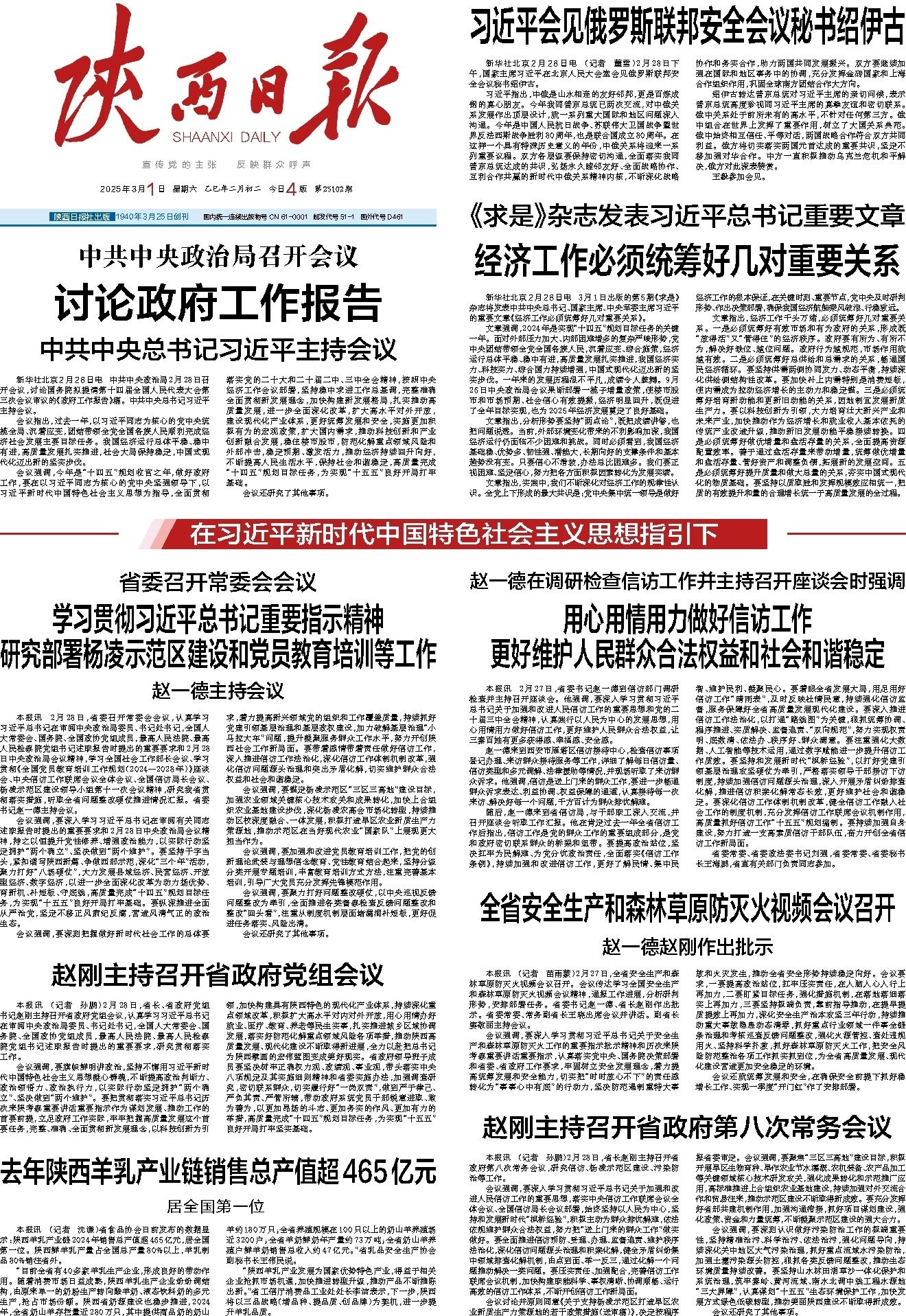 本报讯 2月28日,省委召开常委会会议,认真学习习近平总书记在审阅中央政治局委员、书记处书记,全国人大常委会、国务院、全国政协党组成员,最高人民法院、最高人民检察院党组书记述职报告时提出的重要要求和2月28日中央政治局会议精神,学习全国社会工作部长会议、学习贯彻《全国党员教育培训工作规划(2024—2028年)》座谈会、中央信访工作联席会议全体会议、全国信访局长会议、杨凌示范区建设领导小组第十一次会议精神,研究我省贯彻落实措施,听取全省问题整改硬仗推进情况汇报。省委书记赵一德主持会议。